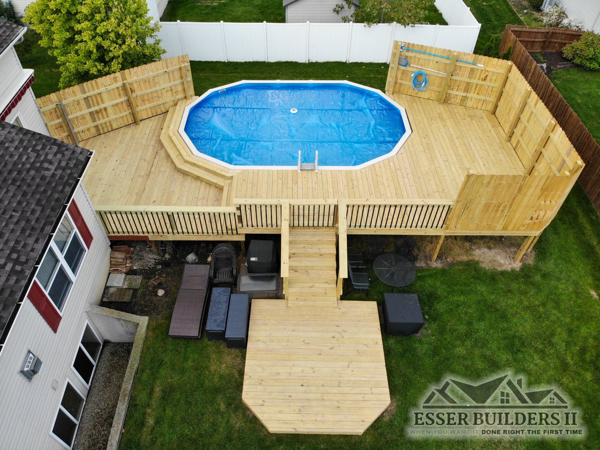 All of our decks and fences are built with treated pine lumber, triple coated screws and anchors to last the test of time. Let us put a fresh top coat of polyurethane to make it glisten and last for generations! All of our deck installers take the time and thought to build a one of a kind ESSER DECK!